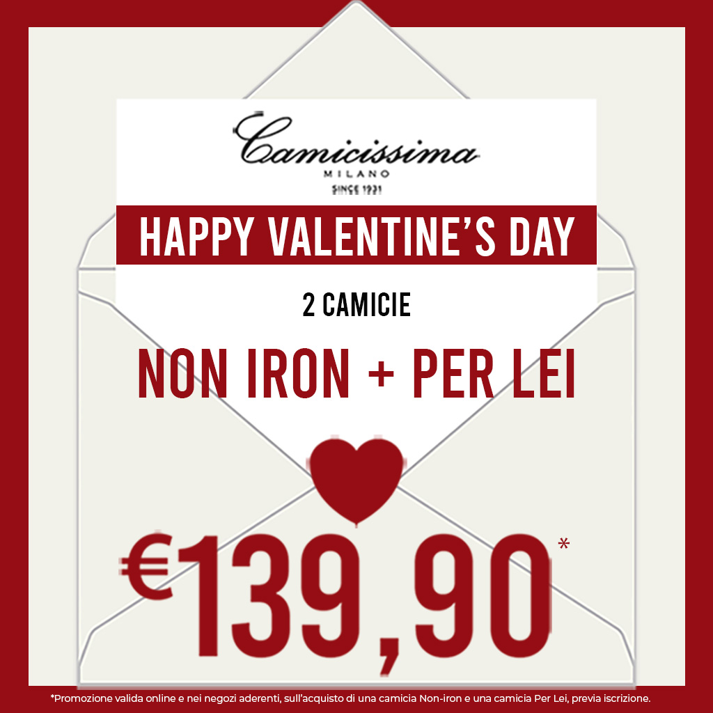 Festeggia il tuo San Valentino con Camicissima! Approfitta della nostra imperdibile promozione: acquista una Camicia Non Iron e una Camicia Per Lei a soli €139,90
