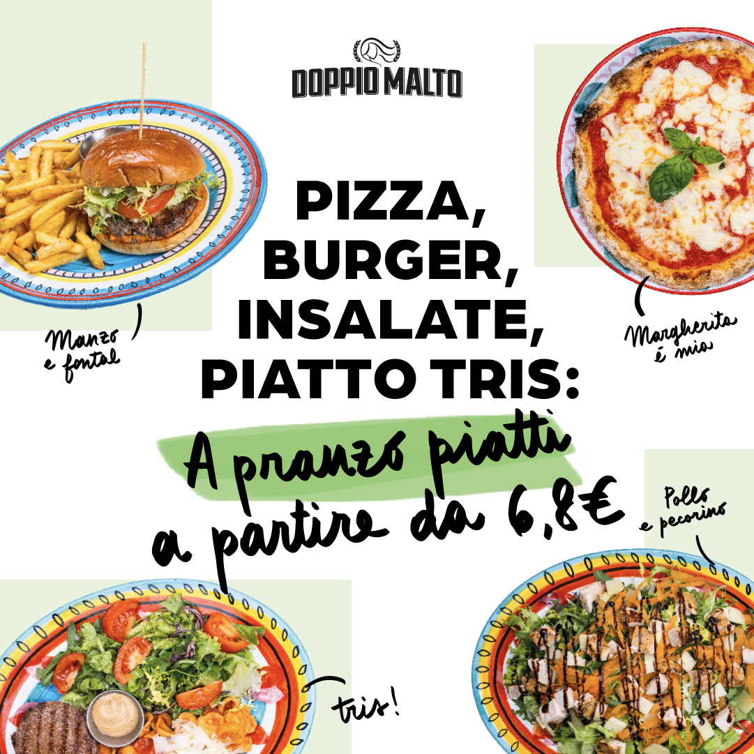 Doppio Malto Lo shopping ti ha messo fame? Fare acquisti vi ha messo sete?Venite da Doppio Malto, vi aspetta un fantastico menù pranzo, con piatti genuini a partire da 6,8€! Vi aspettiamo con birra, cucina e felicità!