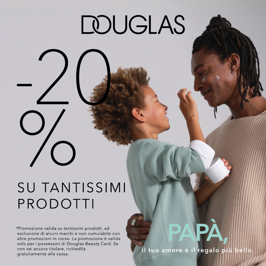 *La promozione è valida su tantissimi prodotti maschili delle categorie skincare e fragranze , ad esclusione di alcuni marchi. La promozione è valida solo per i possessori di Douglas Beauty Card e non è cumulabile con altre promozioni in corso. Per maggiori informazioni vai su douglas.it.