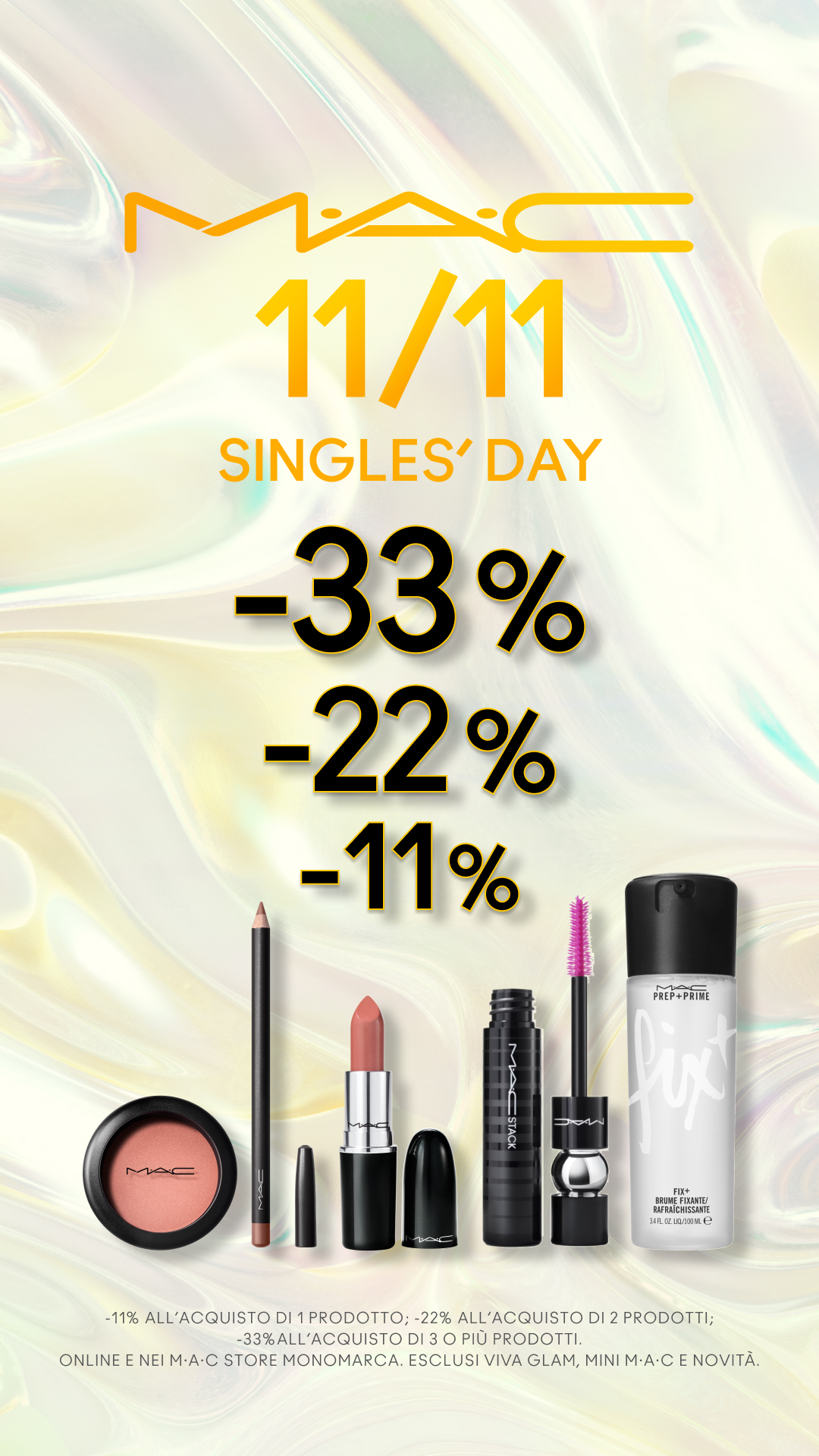M·A·C Il make up di M·A·C in sconto per il Singles’ day! Approfitta delle promo imperdibili con sconti fino al -33%!