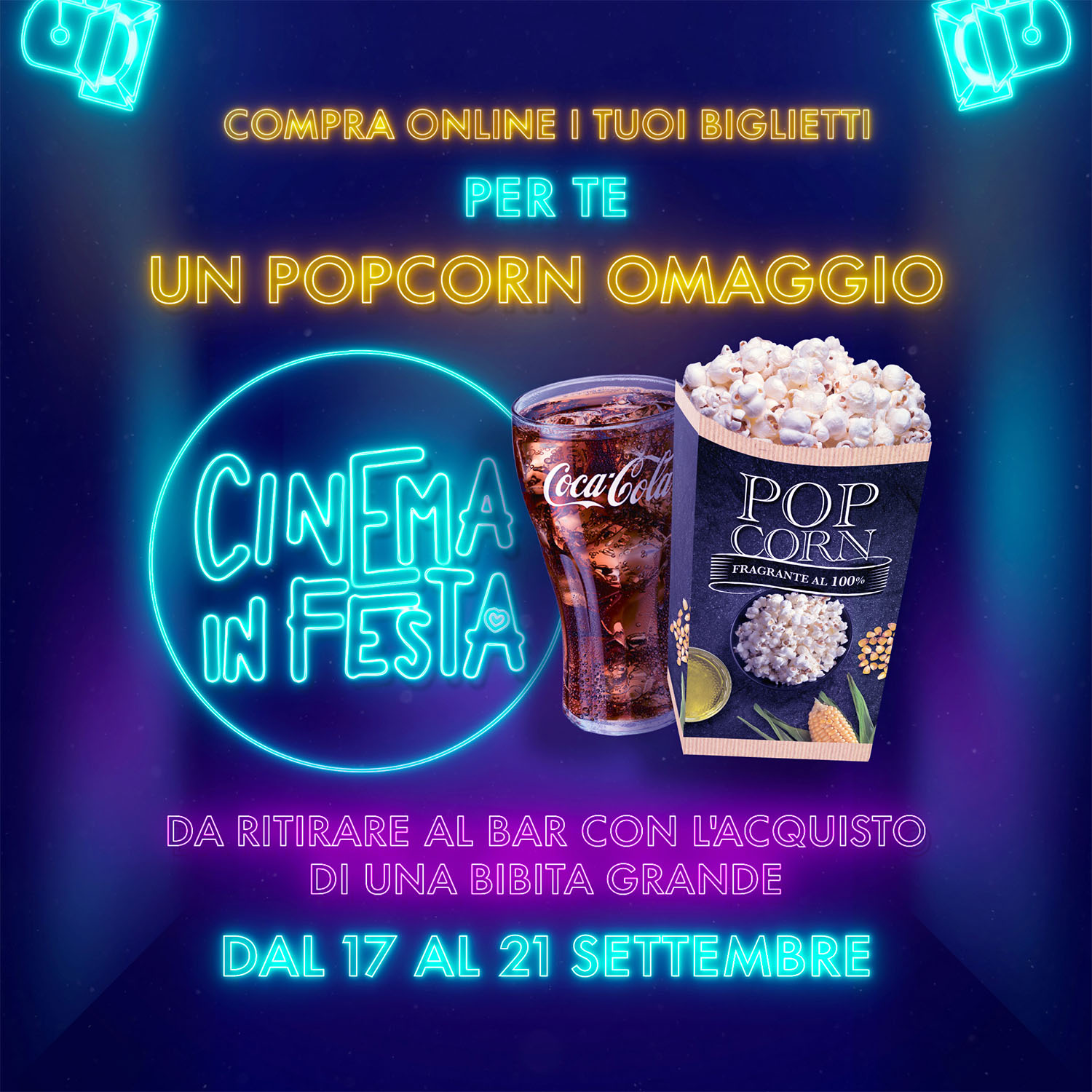 🍿Acquista un biglietto per gli spettacoli dal 17 al 21/09 e una bibita grande da 1L, riceverai in regalo una confezione di popcorn media!