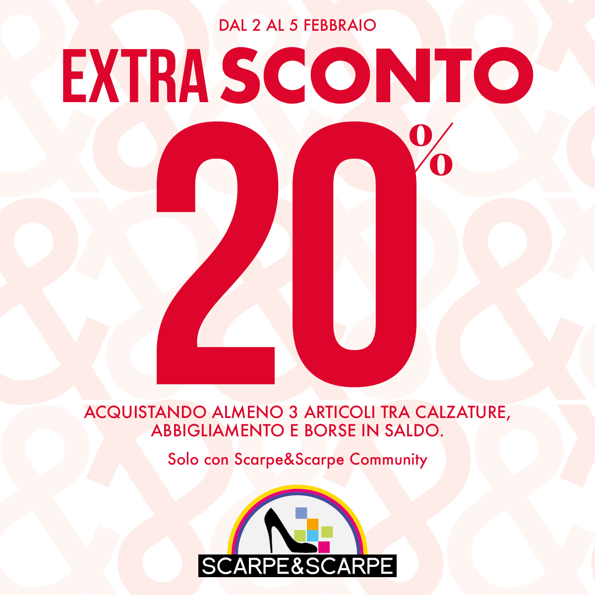 EXTRA SCONTO 20% SUI SALDI FINO AL 70%! Dal 2 al 5 Febbraio da Scarpe&Scarpe approfitta dell’ EXTRA SCONTO 20% sui saldi fino al 70% acquistando almeno 3 articoli tra calzature, abbigliamento e borse (promozione valida con fidelity card “Scarpe&Scarpe Community”)! Ti aspettiamo nel nostro negozio!