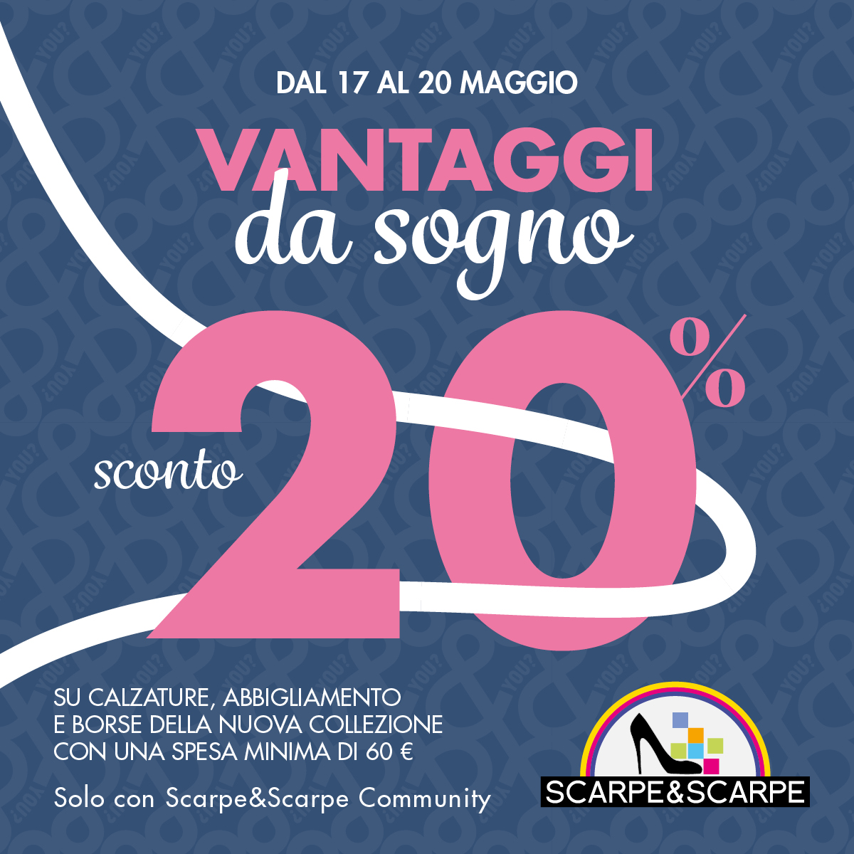 Vantaggi da Sogno! SCONTO 20% su spesa minima di 60€. Da Venerdì 17 a Lunedì 20 maggio da Scarpe&Scarpe approfitta dello SCONTO 20% sulla Nuova Collezione (promozione valida con fidelity card “Scarpe&Scarpe Community”)! Ti aspettiamo nel nostro negozio!